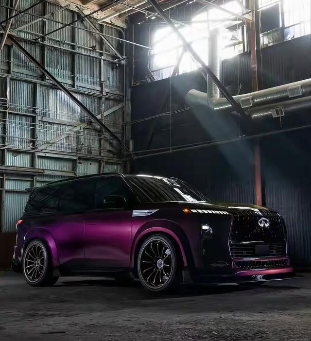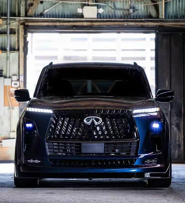 从曝光图来看,新车延续了QX80的经典轮廓,并且新增了专属的运动套件,前脸采用了梯形的大尺寸进气中网,内部辅以菱形网格造型格栅,并做了熏黑处理,和下方的矩形通风口融为一体,而且加入了发光车标设计,两侧搭配了分体式的LED大灯组,采用了竖置安放,大灯上方是钢琴按键样式的LED流水一体式的日行灯和转向灯,搭配机盖上下压式的造型设计,营造了凶猛的氛围,下方换装了定制前铲,造型十分激进,而且还做了变色涂装处理,进一步提升了视觉上的冲击力。